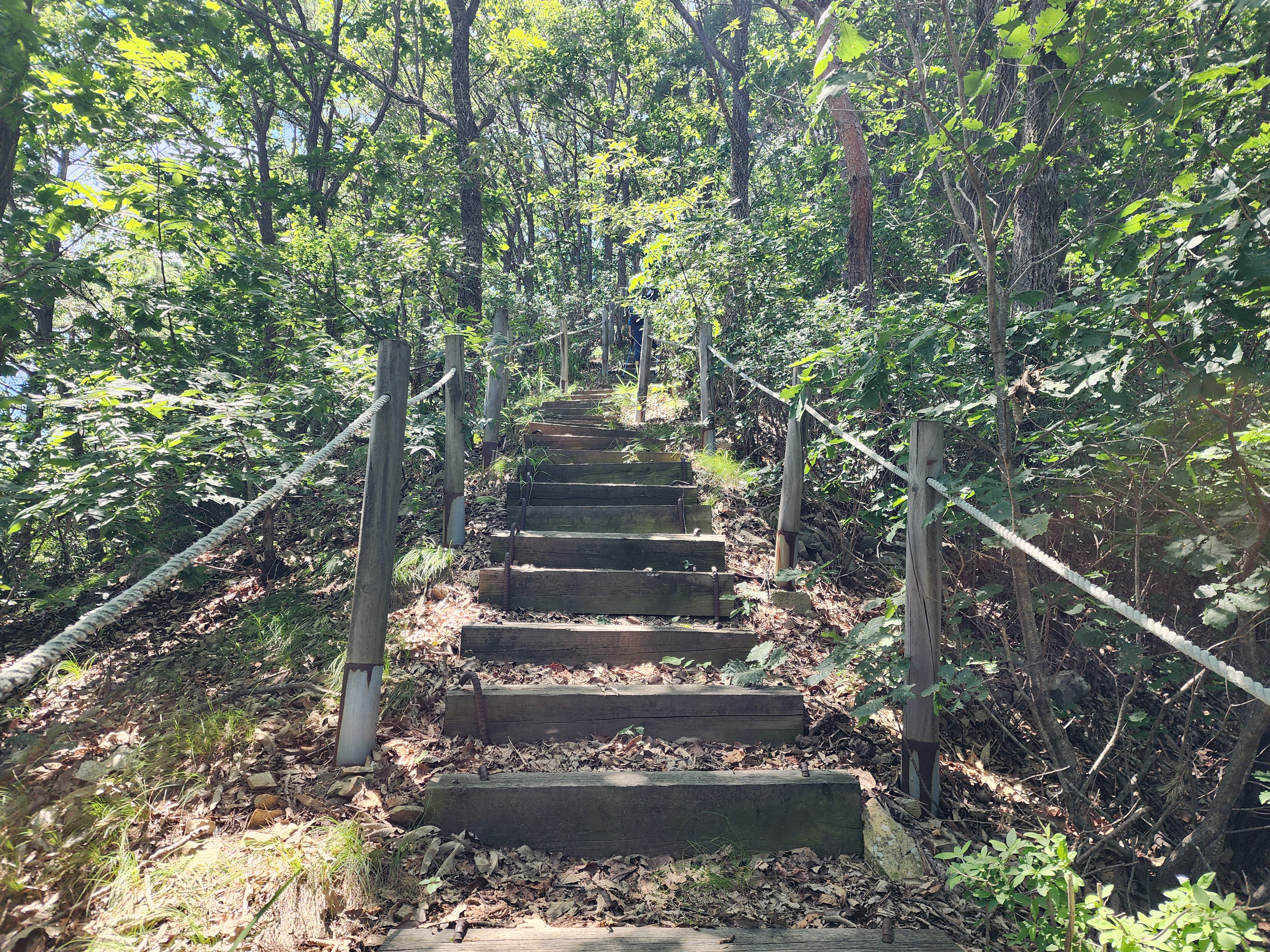 515봉에서 내려가는 나무계단 내리막길이 무척 가파르다.