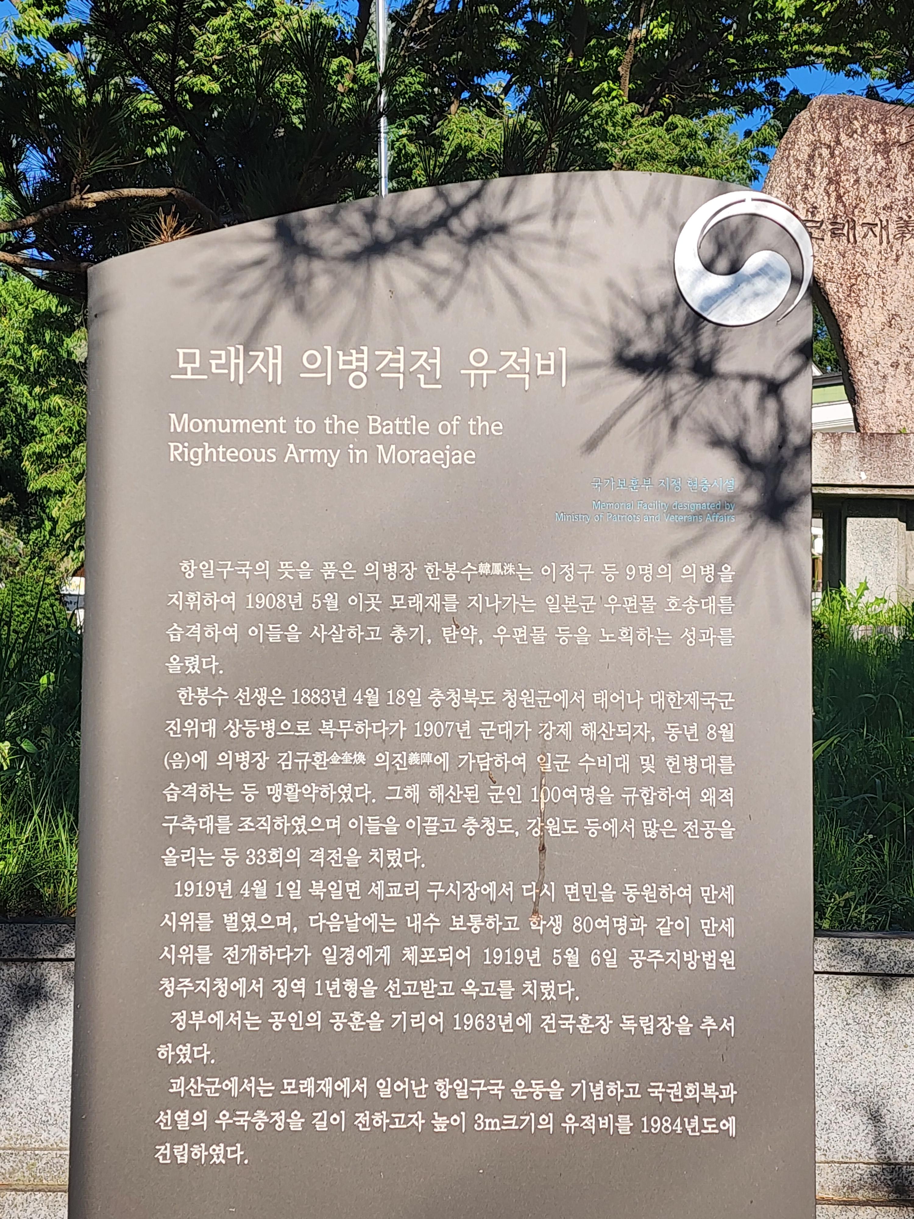 모래재(충북 괴산군 사리면 수암리794-7)에는 의병 유적지가 있다.